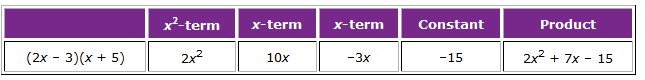 Likewise, you discovered in this lesson that in order to factor a trinomial, you must first break the x-term into two terms. Those terms are then placed centrally in the array. Then you determine the greatest common factors of each column and row to obtain the factors along the top row and left column. This procedure is precisely the reverse of the binomial multiplication procedure using the same array.
