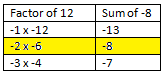 Step 1: The first part is similar to decomposition. Find two numbers whose product is equal to the product of the first term times the third term or 3 × 4, or 12, and whose sum is equal to the middle term or –8.