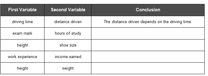 Compare the variables in each pair. Decide which quantity depends on the other. The first row has been done as an example.