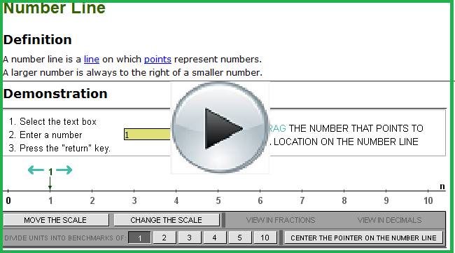 Use the demonstration applet “Number Line” to review the basics of a number line. See if you can use the applet to insert fractions and decimals as well as integers—both positive and negative—on the number line.
