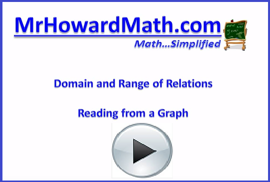 Watch 'Domain and Range of Relations' on a graph to practice finding domain and range. Note he writes his answers in set notation but is not careful about the formatting we like.