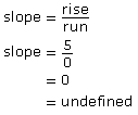 All horizontal line segments are flat and have a rise of zero. Since zero divided by any other number (besides zero) is zero, the slope of any horizontal line segment is zero. - In the graph of the vertical line segment, the rise is 5 units and the run is zero.