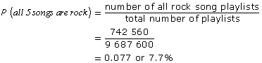 Determine the probability of the 5-song playlist containing 5 rock songs. |