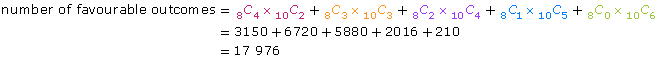 - Determine the number of favourable outcomes. This is the number of ways of choosing 3 boys from 8 boys and 3 girls from 10 girls.