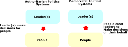 Remember which way power flows in an authoritarian political system compared to liberal democratic systems. Examine the diagram below: