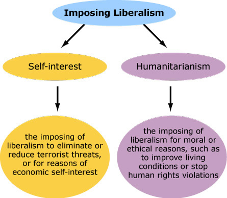 A country may try to impose liberal ideology on people in another country for two reasons: self-interest and humanitarianism.