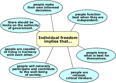 Remember the key liberal values of individualism and liberalism that stress self-interest and self-reliance along with individual rights and freedoms. These liberal values promote individuals maintaining their independence to satisfy their own wants and needs by relying on themselves to act in their own best interests. Above all, government involvement in the affairs of society should be limited. Government should get involved in society for only the following things: