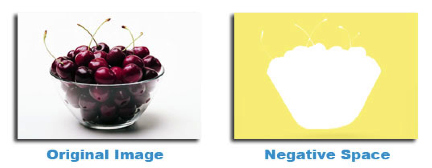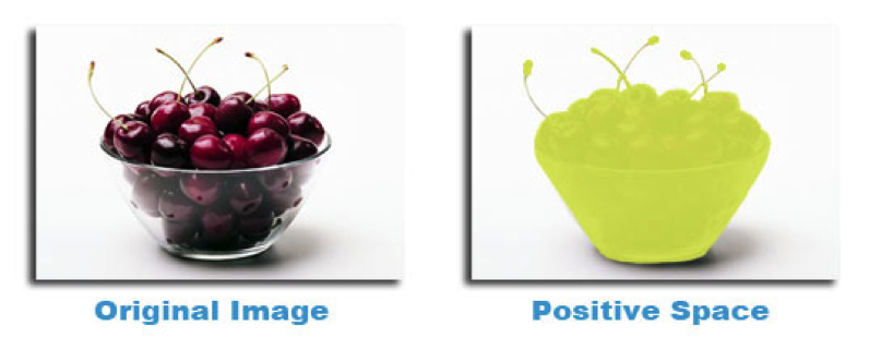 Simply put, positive space is best described as the areas in a work of art that are the subjects, or areas of interest. In an image positive shapes are the solid forms in a design such as a bowl of cherries. In this example it is shown by green shape over the bowl of cherries. Negative Space: