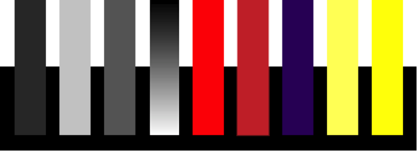 Light values are placed next to dark values to create contrast or strong differences. Look at the examples above and ask yourself which bars stand out the most against their surroundings. The first, (dark) bar is clearly visible against the white background but barely visible against the black. The second, (light) bar 's contrasts are the opposite. The third (gray) bar is equally visible against both black and white but not as visible as the high contrast areas of the first two bars. The fourth (black to white) bar has maximum contrast at either end. The coloured bars add hue and saturation as variables. The two red bars are middle values and contrast equally with black and white. The brightness of the red, however, makes it more visible. The violet bar corresponds to the first dark gray bar in contrast -- high against white but low against black. The two yellow bars correspond with the second light gray bar in contrast. The brighter yellow does make that bar more visible even against the white -- but that contrast is still low and will be noticeable only depending ont the background. For example, against black it has both strong value contrast and strong colour appeal. Value Scale: