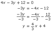 A linear function is described by the equation 4x − 3y + 12 = 0. Identify the slope and y-intercept of the graph.