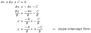 Retrieve your results from Math Lab: Analyzing General Form. In Part A, you rearranged equations given in general form to equations in slope-intercept form. You can do this also in the general case: