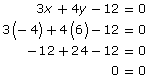 Verify the point (−4, 6). Substitute x = −4 and y = 6 into the equation 3x + 4y − 12 = 0.