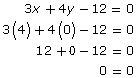 Verify the point (4, 0). Substitute x = 4 and y = 0 into the equation 3x + 4y − 12 = 0.