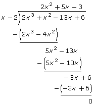 f(x) = (x − 2)(2x2 + 5x − 3) This equivalent factored form can be written using f(x) = (x a)Q(x) + R, where Q(x) is the quotient and R is the remainder.