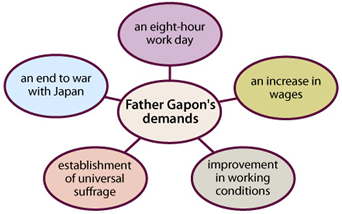 In addition, the year 1904 had been a bad one for Russian workers. Prices of basic goods and services had risen quickly, and wages declined by 20 per cent. When four members of the Assembly of Russian Workers were fired from an iron works factory, Father Gapon decided to take action. Under his leadership, more than 110 000 workers in St. Petersburg went on strike.