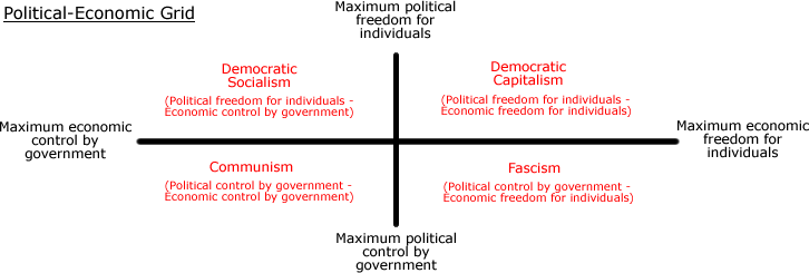 Fascism can be placed on a spectrum grid that shows economic and political individual freedom or government control: