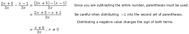 The following example shows how to prevent a common error that occurs when evaluating rational expressions in subtraction. Pay attention to how parentheses are used to keep the binomials in the numerator separated to start and how this expression is then simplified.
