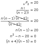 To solve this equation, substitute in the formula nPr. When the solutions are checked, n = −4 is not a solution because n must be a natural number. Therefore, the only solution is n = 5.